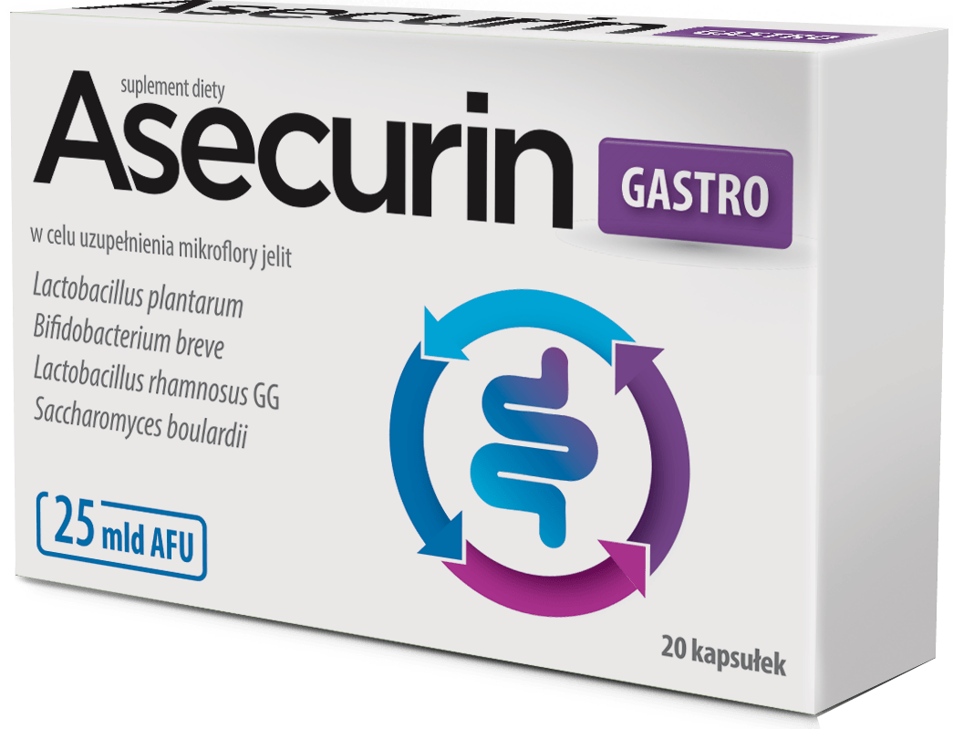 Suplement diety Asecurin GASTRO to połączenie specjalnie wybranych szczepów bakterii probiotycznych, które w naturalny sposób uzupełniają mikroflorę jelitową oraz drożdży.